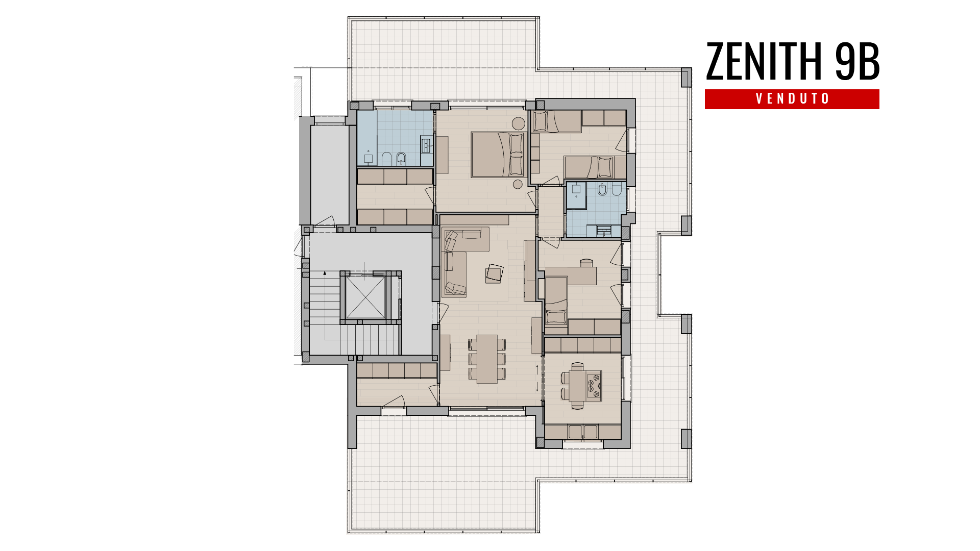 Le unità poste all’ultimo piano godono del massimo dell’indipendenza e della privacy, contando oltremodo su una vista libera a 360°. Gli spazi generosi spaziano verso l’esterno costituito da mq 90 di terrazzi per lo più coperti. Ancor di più la zona giorno e l’esterno sono un tutt’uno senza soluzione di continuità.